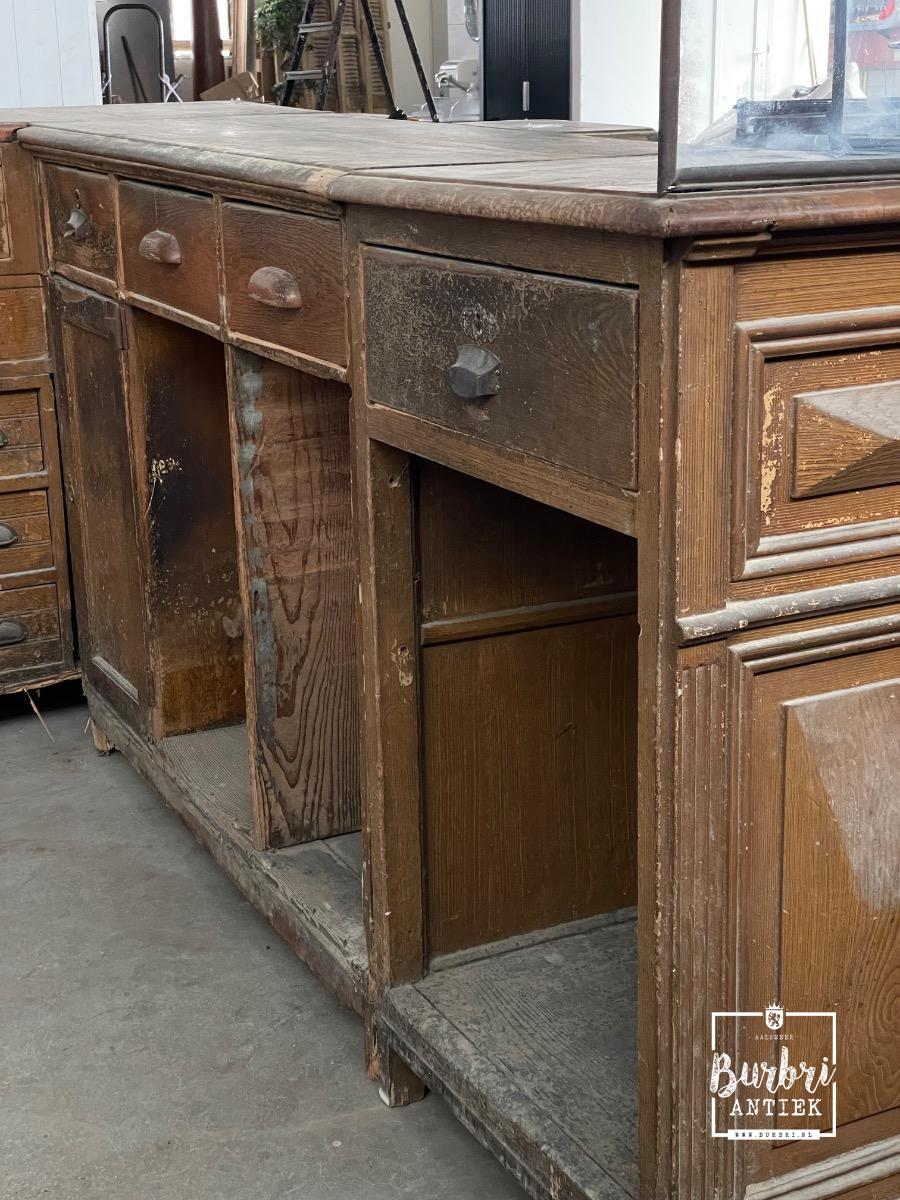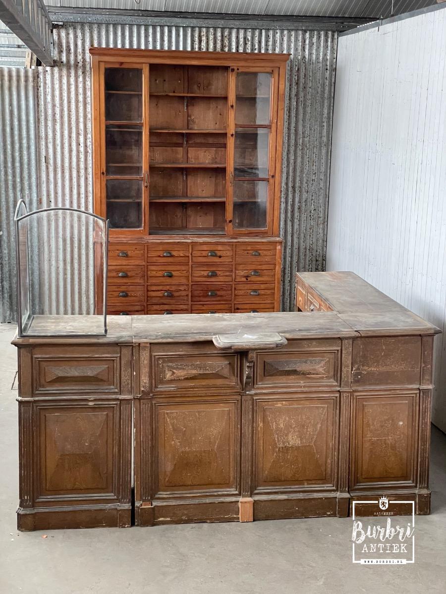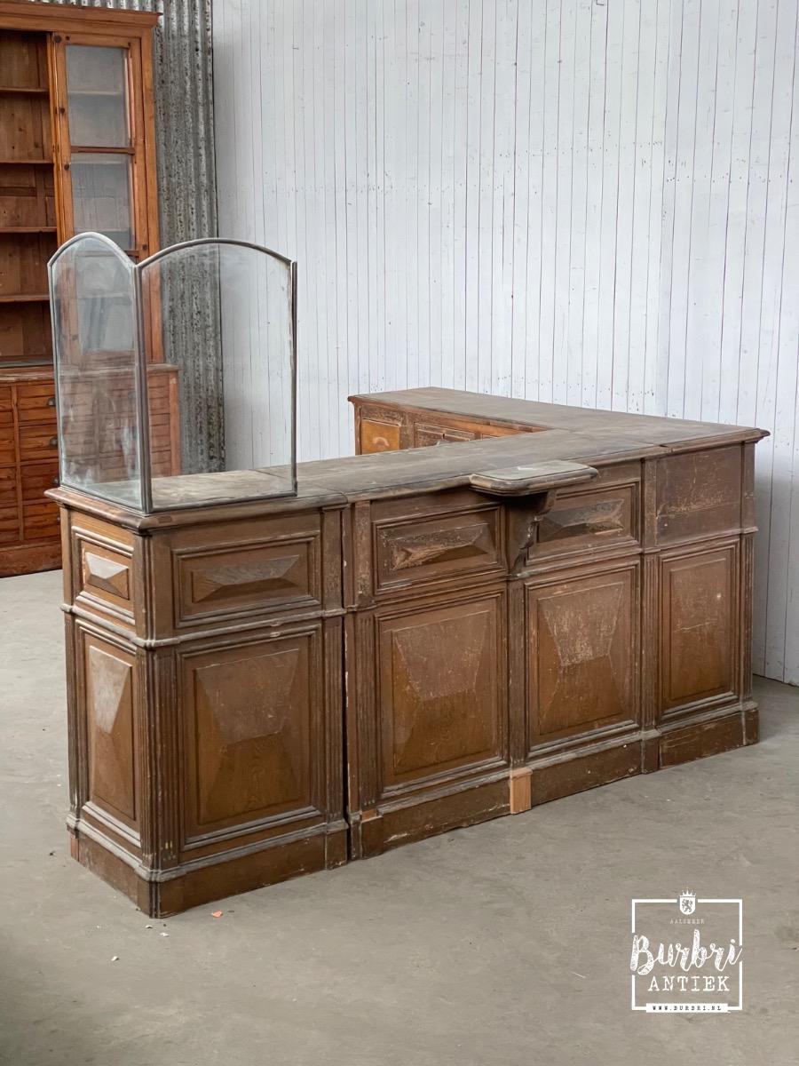 Antieke hoek toonbank met glazen balie, Frankrijk 1900